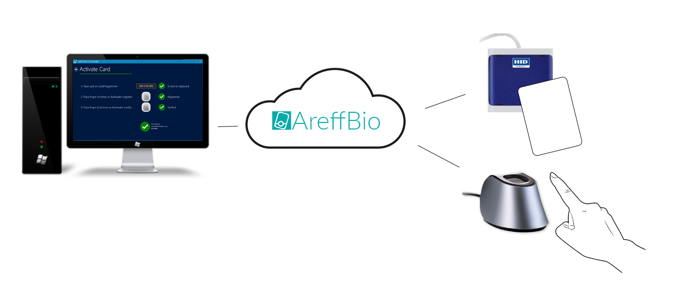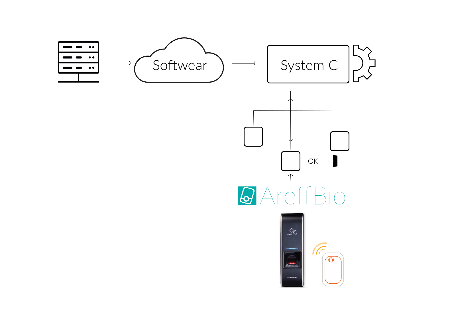 AreffBio ansluts till ett befintligt accesskontrollsystem för att höja säkerheten i en eller flera dörrar. AreffBio accessläsaren ansluts till en undercentral/nod i ditt befintliga system (se skiss nedan).Vid en önskad passage så identifierar sig användaren först med sitt kort/nyckelbricka. Förutom användarens ID så läses även användarens biometriska signatur in i läsaren. Därefter läses användarens verkliga fingeravtryck av via den biometriska linsen. Det som sker nu är att läsaren automatiskt jämför användarens verkliga fingeravtryck gentemot den biometriska signaturen som är inläst från användarens kort/nyckelbricka. Om dessa två matchar skickar läsaren användarens ID vidare till undercentralen/noden. Om noden anser att detta ID får passerar, så öppnas dörren.